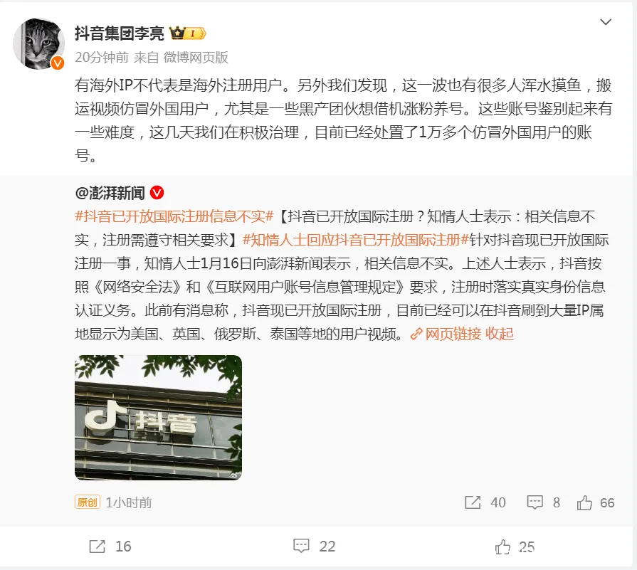 抖音集团副总裁李亮16日在微博发文称,有海外IP不代表是海外注册用户。另外抖音方面发现,这一波也有很多人浑水摸鱼,搬运视频仿冒外国用户,尤其是一些黑产团伙想借机涨粉养号。这些账号鉴别起来有一些难度,这几天抖音在积极治理,目前已经处置了1万多个仿冒外国用户的账号。